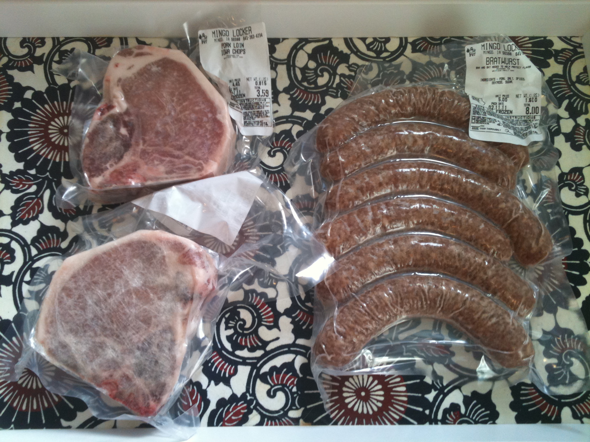 The first share worked out perfectly spread out over two months: we still have one pound of ground pork as well as six hamburgers we made and froze.  As planned, we did not purchase any meat at the grocery store other than a small amount of prosciutto Jarrod talked me into for panini purposes.  When Jarrod was in Iowa a few weeks ago he did purchase two pork chops and a bunch of brats from the Griffieon Family Farm.  Can’t wait for summer BBQs!