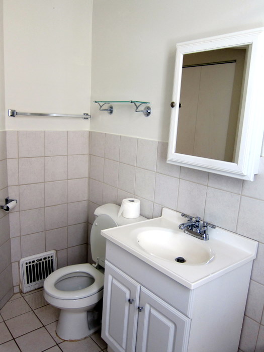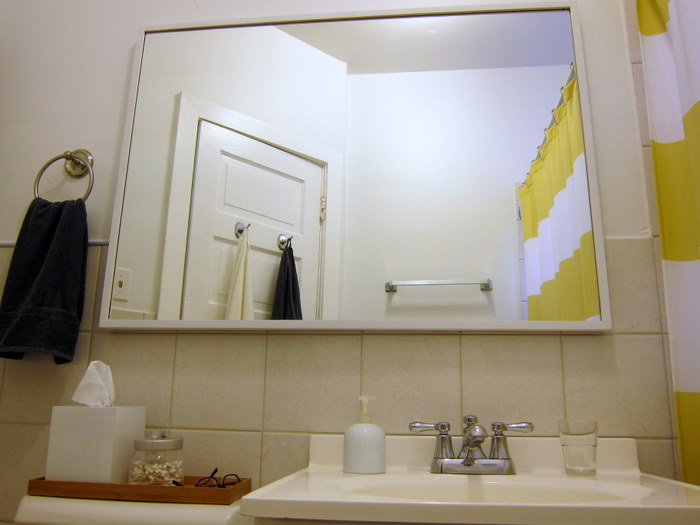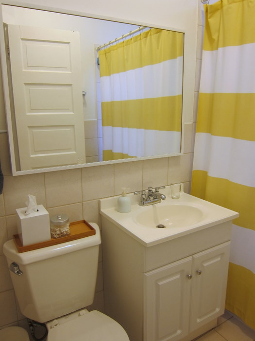 I love the bright shower curtain and the new larger mirror. Why would the previous tenants have put in such a small medicine cabinet. Great use of the space :)