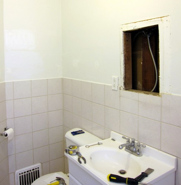 So, down came the medicine cabinet and the shelf along with the towel bar.