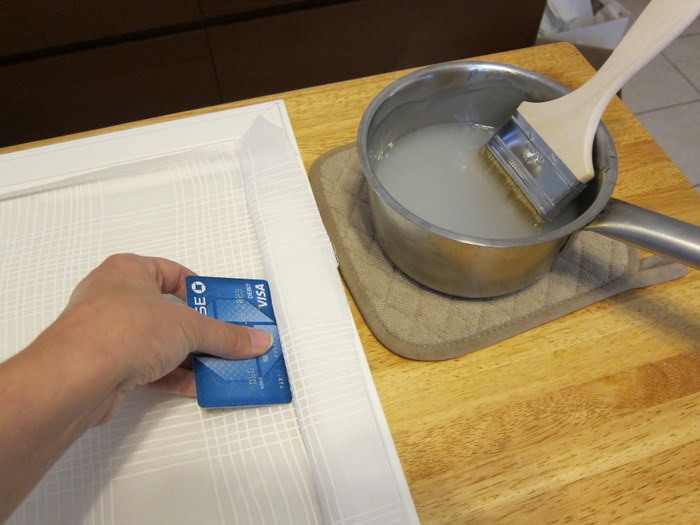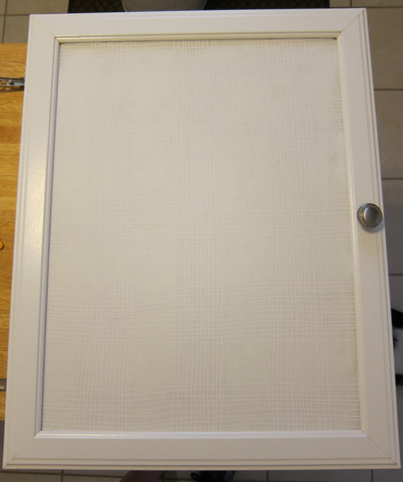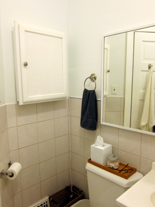 We painted the walls Benjamin Moore Decorators White (you might think the walls were already white, but you’d be wrong – note the swatches in the top left corner of the picture above). I shopped for a wall-mounted storage option before realizing that I could simply repurpose the cabinet I removed. I covered the mirror using the starch + fabric approach discussed on various blogs (e.g., here, here and here).  Measuring and cutting fabric super-precisely can be a drag, so I cut my material (a remnant I had on hand) a little bigger than needed and applied it to the mirror, using a defunct debit card* to push it tightly into the edges.