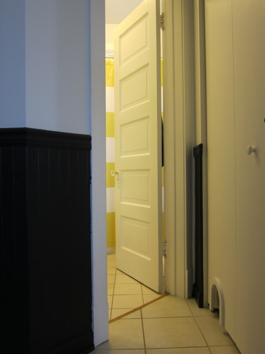 Look at that crazy angle! How did this floor plan happen?! (Sneak peak of the black wainscoting, by the way, and that’s the aforementioned cathole.)