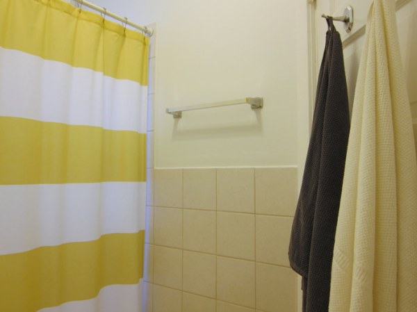 All in all, I’m happy with the bathroom now. It came together pretty quickly and cheaply thanks to using supplies I had on hand. The landlords paid for the paint. The only thing I splurged on was the West Elm stripe shower curtain and some cheap IKEA FRAJEN towels (which are actually pretty nice – they have a sewn-in hanging loop and I like thinner towels for quick-dry purposes).
