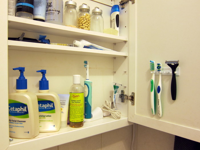 There was a medicine cabinet above the sink, which I didn’t like because it protruded into the sink space and the mirror was too small, and there was a glass shelf above the toilet, which I didn’t like because those things are really only good for displaying your cologne collection and I stopped wearing Cool Water in seventh grade.