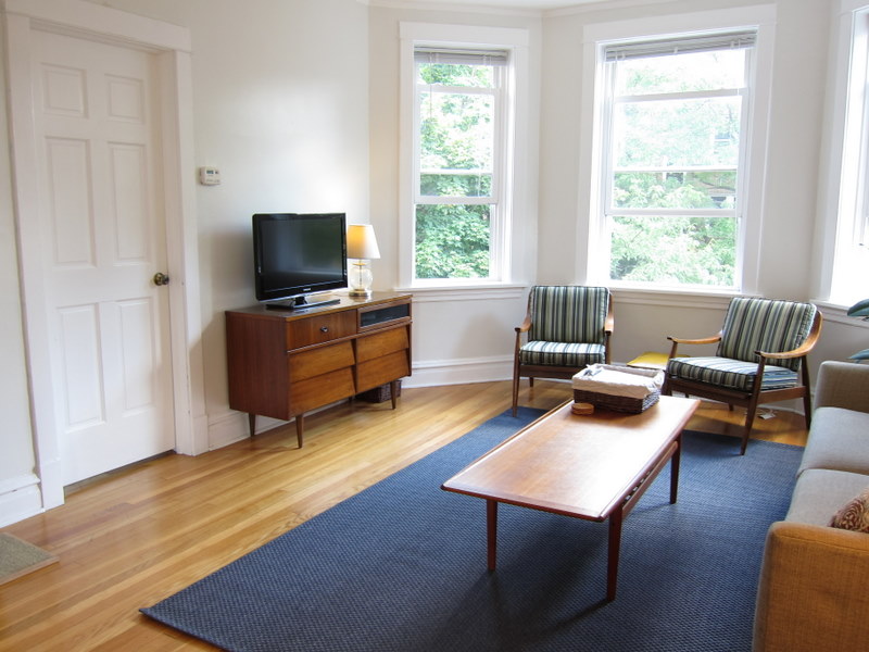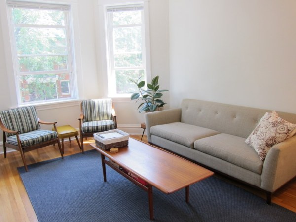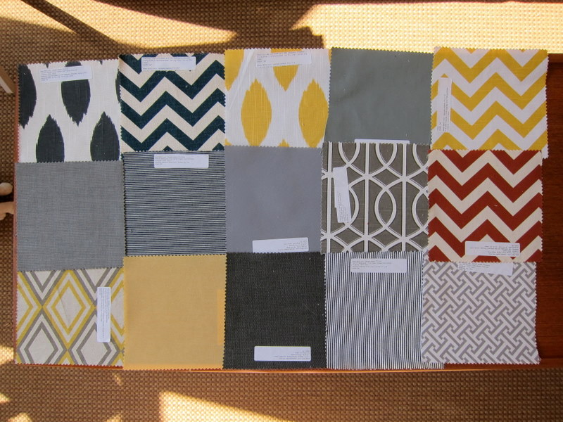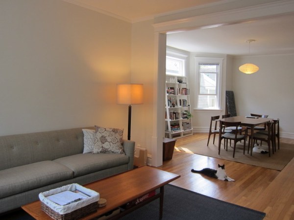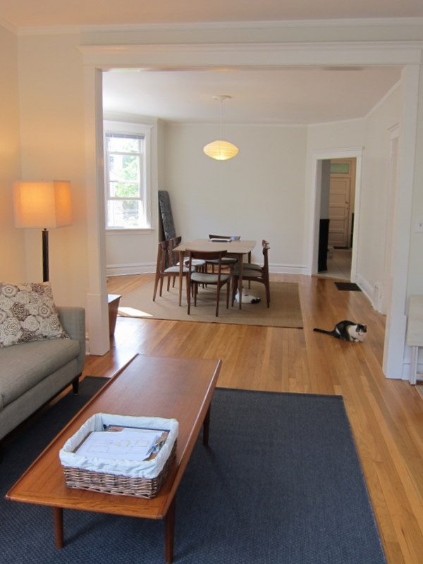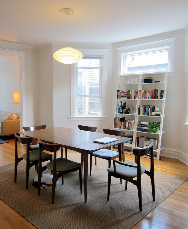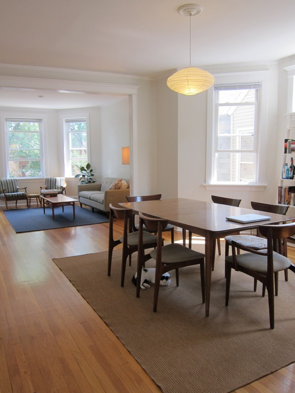 Clean and spacious but also barren and flat. Suffice it to say there are long to-do and to-buy lists for this space. Both rugs will be replaced: the dark gray/blue one in the living room isn’t the right size and the brown one in the dining room is too brown. I’m waiting for the perfect colorful rug to appear in my Craigslist feed, and then I’ll let that guide the other decorative decisions. In the meantime, I have a steady stream of fabric samples arriving from Fabric.com: