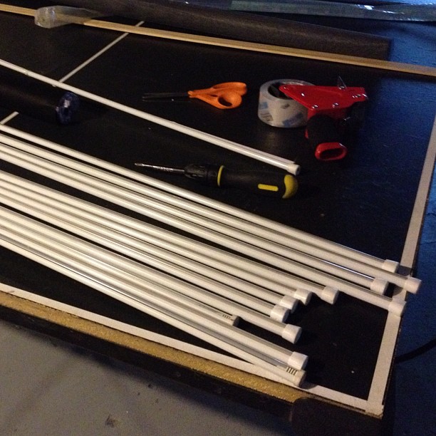 What do I have a lot of? Curtain tension rods. What about a barrier? Leftover weed-blocking fabric. How will I put it all together? Packing tape and a stapler, duh.