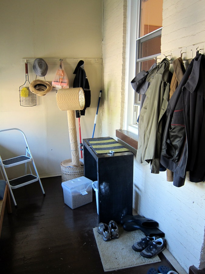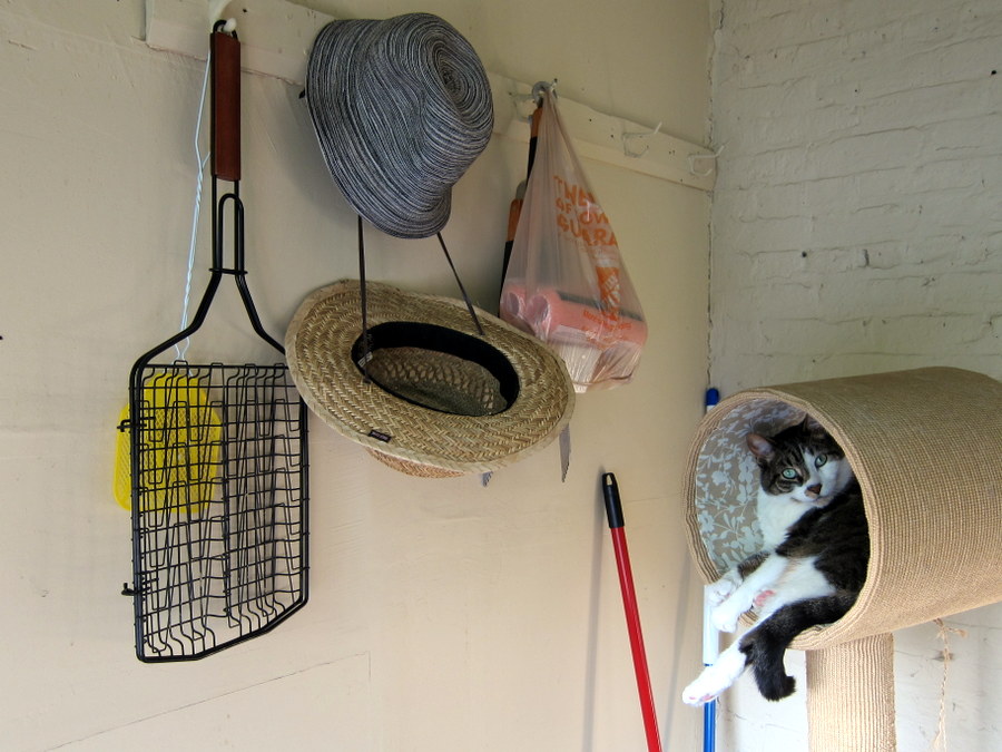 We have an abundance of storage elsewhere in the apartment (a luxury, I know), so my only goal was to make the porch as un-gross as possible, with as little stuff on the ground as possible so that it will be easier to sweep. Also, it’s to our benefit to make it cat-friendly because it means less time they’re inside yowling at us.