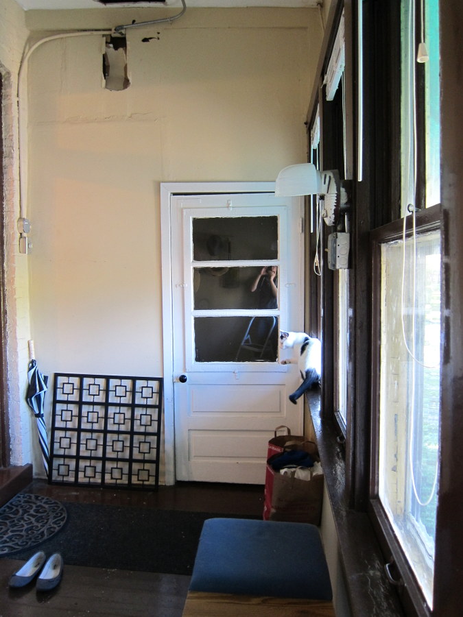 Enclosed back porches are pretty standard on Chicago apartments. They’re handy for storage and it’s nice that you don’t have to go outside to get down to the basement laundry room, but they can also be shoddily constructed heat traps. Ours slopes down dramatically and is painted a gross fleshy color our landlords must have thought was a nice neutral.