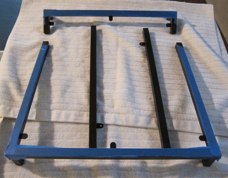 Sawing left me with the pieces seen below. Modifying the bottom rails was easy; I just needed to drill new screw holes at the end of each piece to replace the holes I sawed off. The top was more challenging because I needed to reconnect the pieces in a way that would be as stable and seamless as possible.
