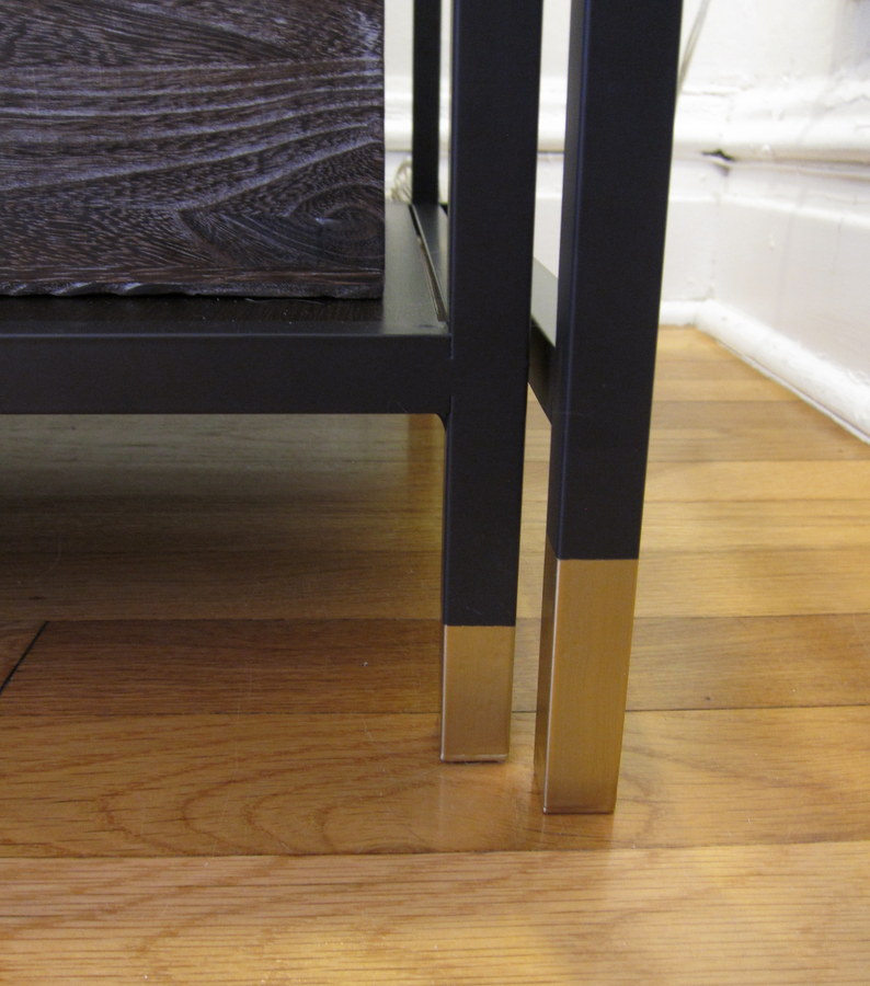 Step five, don’t you know that the time has arrived… to dress it up a bit with some gold dip-dyed legs. I tried three different types of gold paint and will compare the products in another follow-up post that you can await anxiously: Plaid’s Liquid Leaf in Brass, Rub ‘n’ Buff in Gold Leaf and Krylon’s Gold Leafing Pan. I liked Liquid Leaf best. (Update: see Gold Leaf Paint Options)
