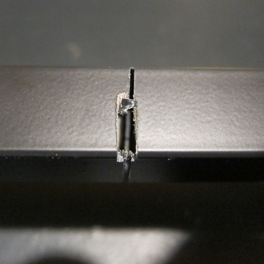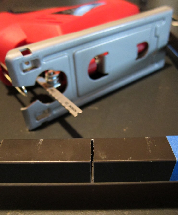 Con: In my experience, a jigsaw was less user-friendly for this job.  To ensure a straight cut, you need to clamp down both the item itself (so that it doesn’t bounce around) and a guide rail (to ensure that your saw stays on a straight path – see an example here).   I don’t have a lot of clamps or a fancy worktable, and it’s difficult to set a guide rail for such a small item.  The cut above isn’t as clean because the metal tube was vibrating.
