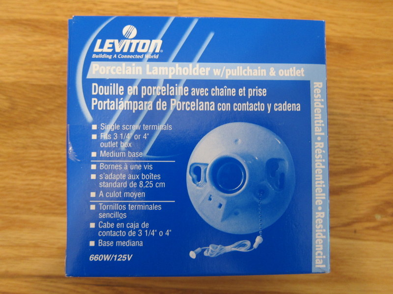 We have outlets at the back of our closet and I had a plug-in HEMMA cord set from IKEA on hand. My original idea was to use the cord set to hang a light from the ceiling with the addition of a pull-chain socket adapter (like this) so that the light could be turned on and off easily. I went to Matty K’s — a great independent hardware store in Lincoln Square — to pick one up, but realized that the adapter pull-cord was actually pretty hard to pull and would put a lot of stress on a ceiling anchor hook. I then saw this porcelain lampholder with a pullchain.