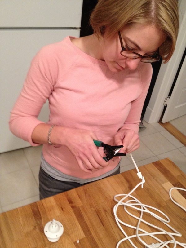 I’ve seen a lot of blog posts in which people cut off the plug of a HEMMA cord to convert it to a hardwired light fixture, which gave me the idea to cut the socket off instead, leaving the plug and hard wiring the cord to the lamp. A super nice Matty K’s employee suggested that I mount an electrical outlet box to the ceiling as a base for the lampholder, making it safe and sturdy.