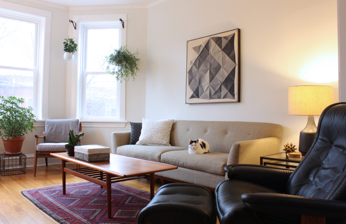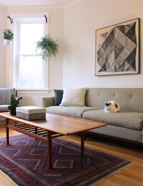 Great DIY artwork, and your living room looks so spare clean and lovely Your kitty is quite decorative, too! I do have a question: are there really no window coverings? I actually feel a bit vulnerable and exposed just looking at the photos!