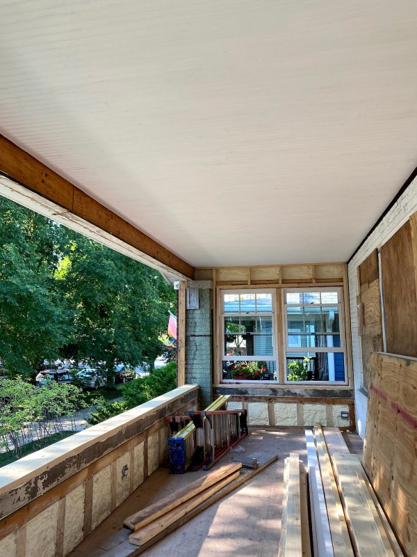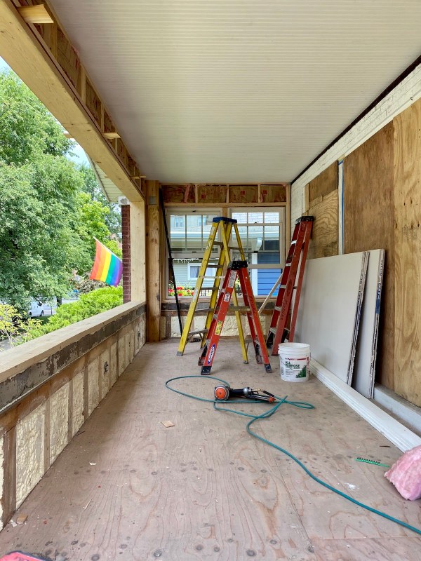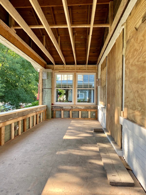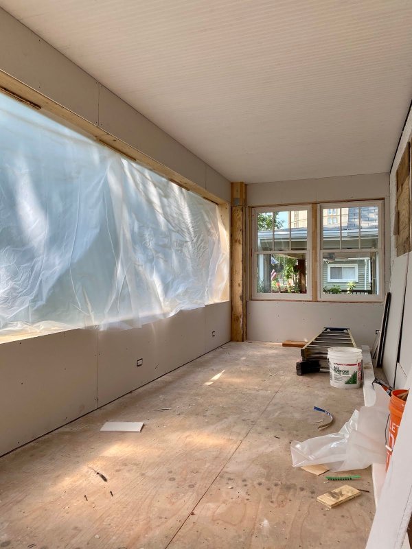 We closed out the week with fresh drywall, and the room started to feel like a room again. But it was another full week before the front windows were installed – lucky for you, you only have to wait until tomorrow to see that.