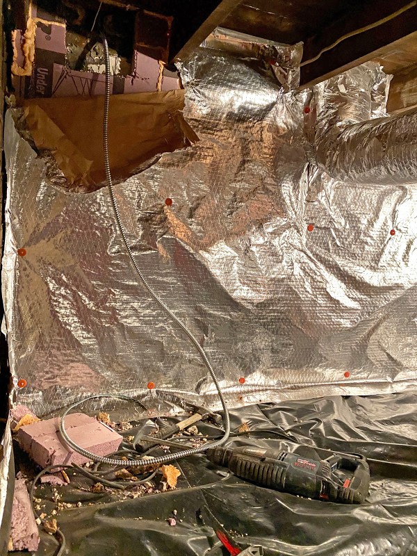 In case anyone is curious, the electrical was run through our crawl space below the sunroom. It’s a big space down there – the same width and depth as the sunroom – but we don’t use it for storage that much because we have so much room in the basement (see Our Clean, Organized, and Practical Unfinished Basement).