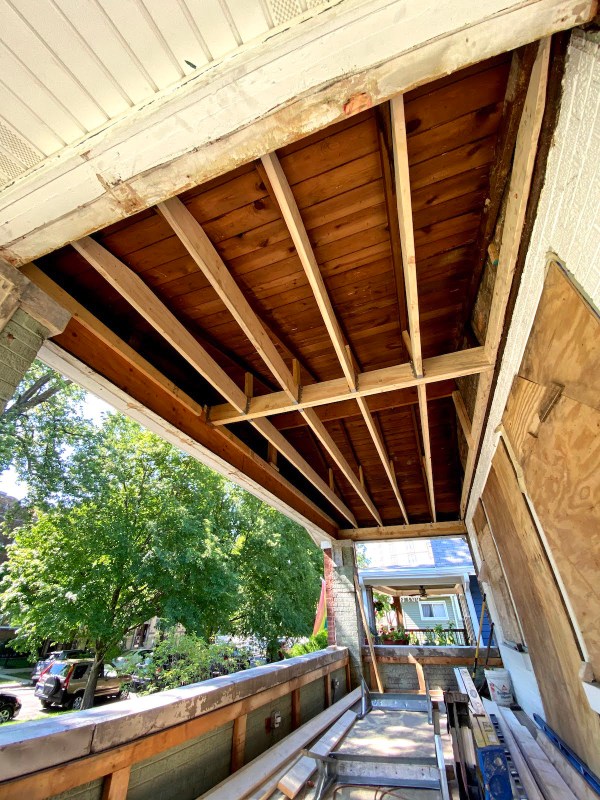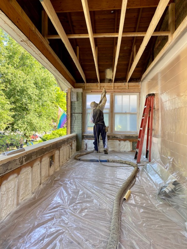 On Day 6 it was time for spray foam insulation. I won’t lie: this was nearly as exciting as the first window installation. There had previously been no insulation under the roof. With so much glass, I wanted to make sure the rest of the room was as energy efficient as possible.